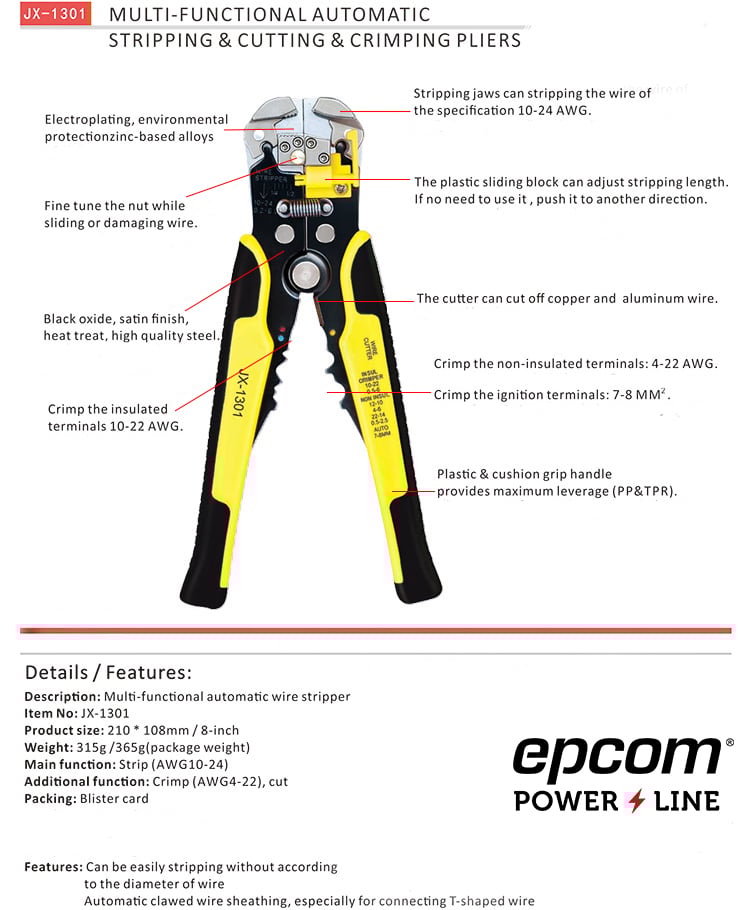 Pinza multifuncional Pelacables, con terminal de pestaña, prensado automático de color amarillo.