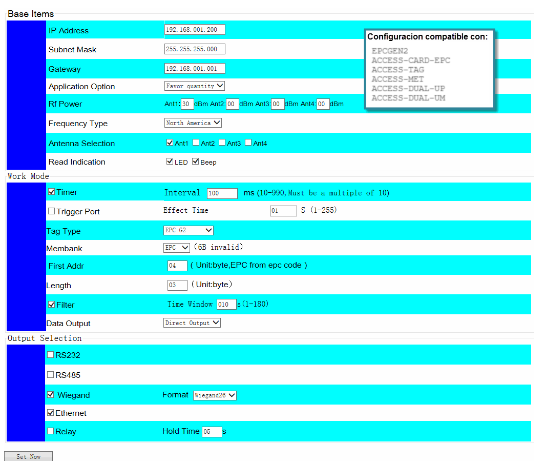 - Salida Wiegand de 26 bits para tags EPCC1GEN2.