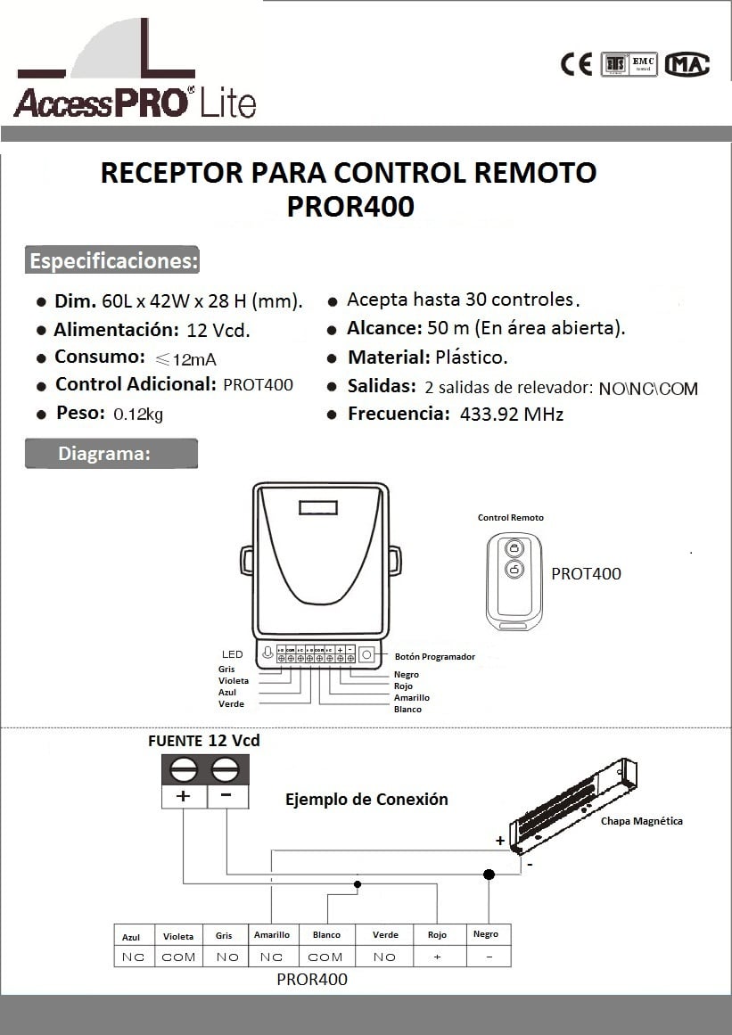 - El modelo PROT400 es un control remoto adicional para el receptor PROR400 el cual puede aceptar hasta 30 controles (PROT400 y PROB400) y controlar distintas aplicaciones como puertas de Garaje, barreras vehiculares, puertas corredizas, chapas magnéticas entre otras.